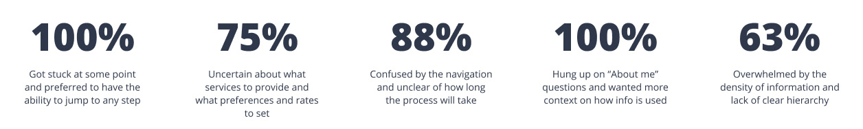 I worked closely with a User Researcher to gather insights and identify pain points on the existing experience. We conducted in-person usability studies with 8 participants that were new to Rover and had an expressed interest in becoming Rover sitters. We also used data analytics to identify where funnel drop-off was occurring.